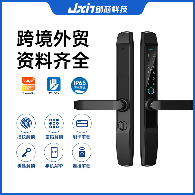 Kunci pintar sidik jari aluminium thermal break JX01S untuk pintu geser KFC, tahan air, kendali jarak jauh melalui ponsel, dengan kunci sandi anti-kunci.