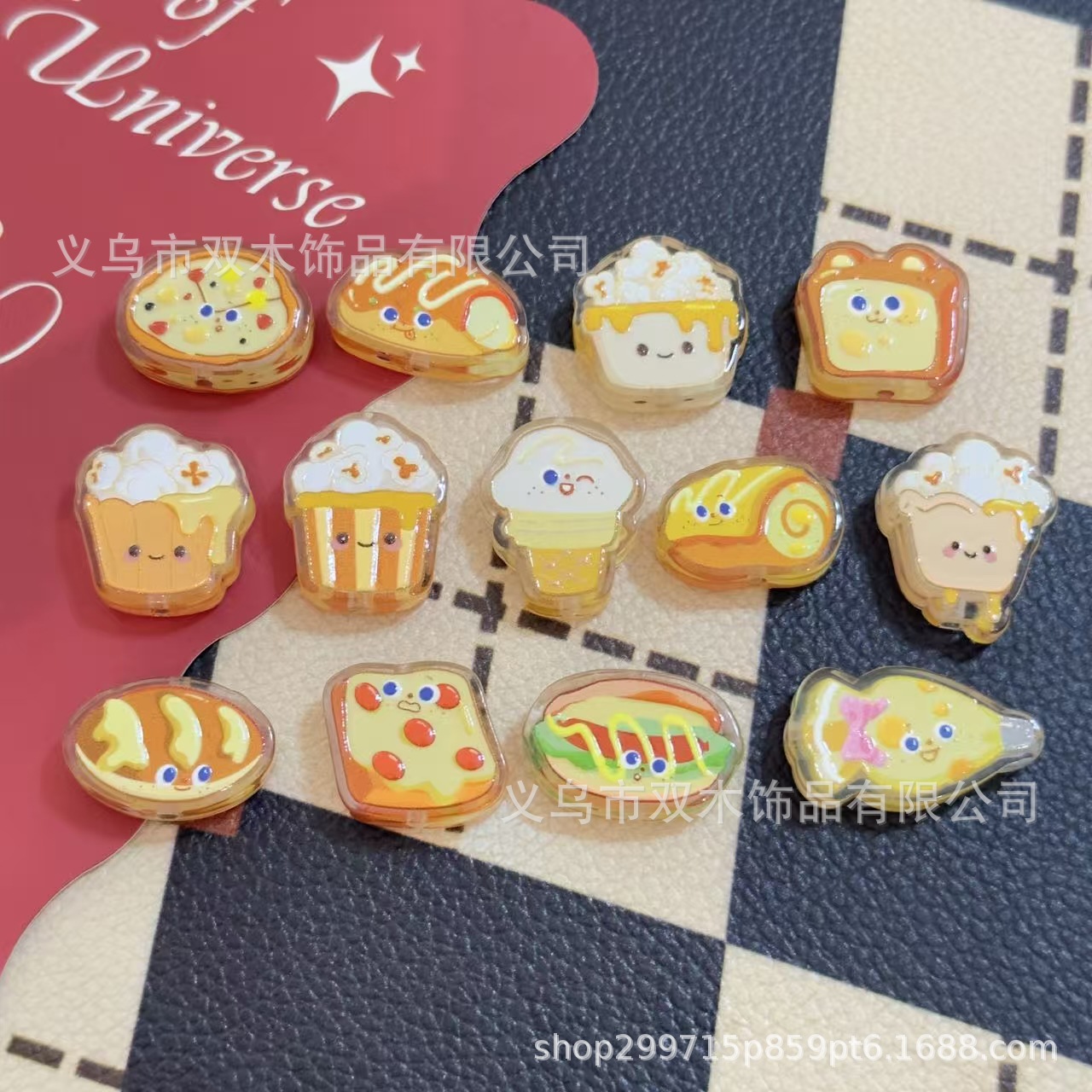 黄色系印花浮雕热狗面包甜点板材串珠 diy手链手机链包挂车挂配件