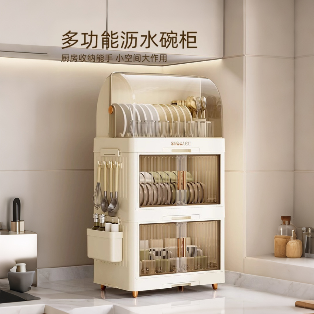 Rak Penyimpanan Mangkuk Piring Dapur Rak Penyimpanan Peralatan Makan Tiriskan Air Piring Mangkuk Kapasitas Besar Tahan Debu Lemari Dua Lapisan