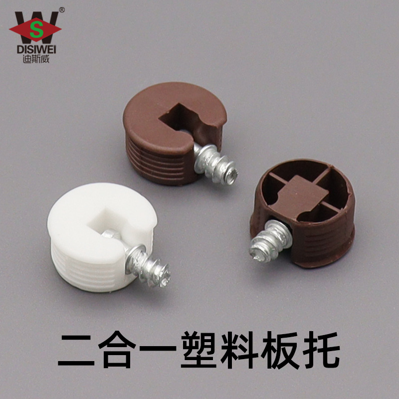 Diskon pabrik pelat langsung mendukung aksesori perangkat keras furnitur pelat penghubung kabinet pin plastik dua-dalam-satu penyangga rak