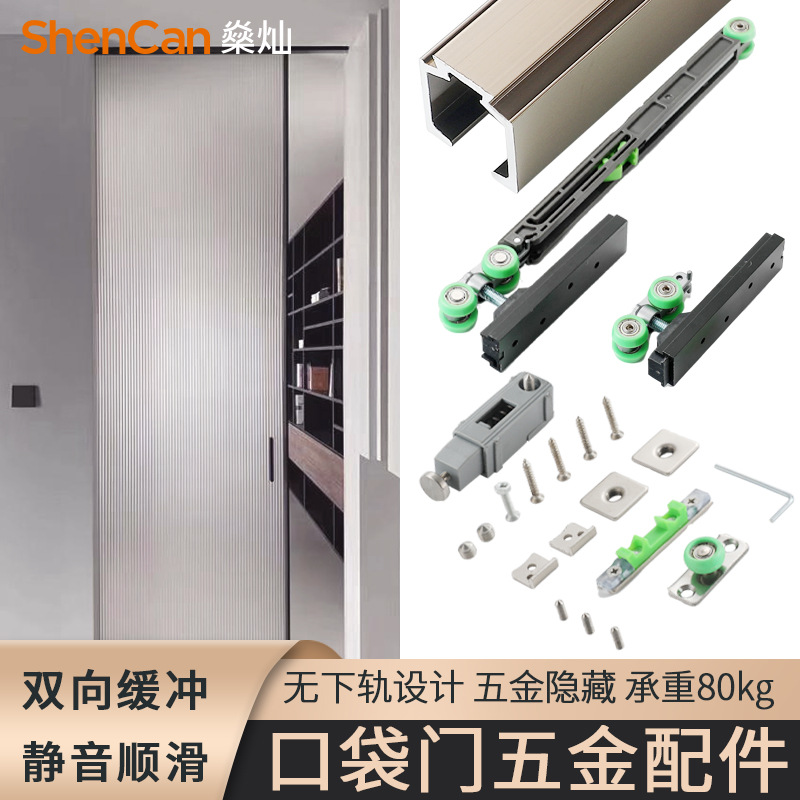Tekan elastis pintu saku rel gantung tak terlihat pintu geser panduan rel peredam kejut pintu geser rel trek katrol set lengkap perangkat keras
