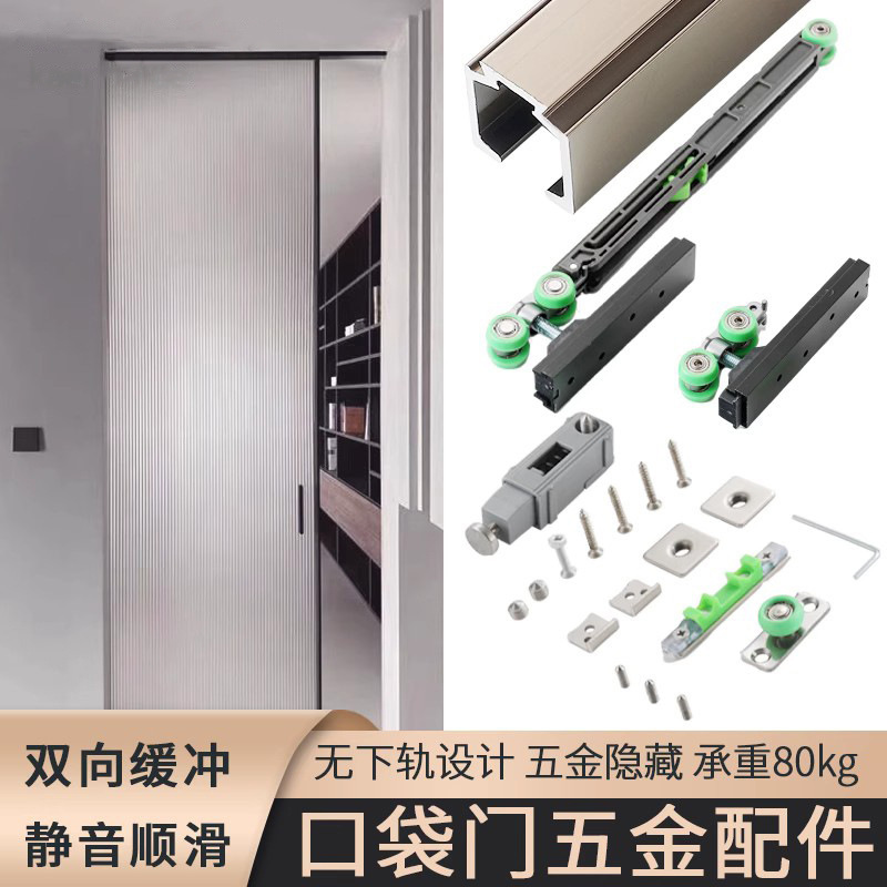 Tekan elastis pintu saku rel gantung tak terlihat pintu geser panduan rel peredam kejut pintu geser rel trek katrol set lengkap perangkat keras