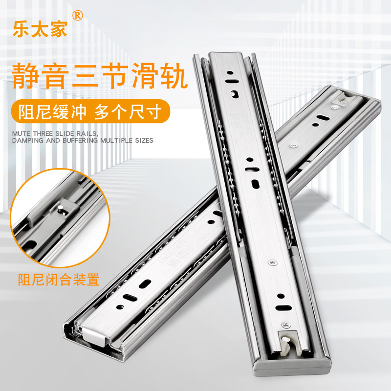 Pasokan langsung pabrik laci penyangga baja tahan karat redaman rel geser furnitur tiga bagian rel kabinet panduan rel lemari pakaian jalur bola baja