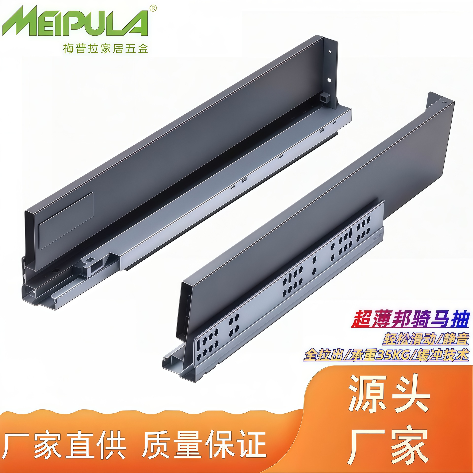 Rak celana ultra tipis dengan rel geser teleskopik, rel geser samping laci yang ditinggikan, rel pemandu mewah, peredam furnitur, dan mekanisme penutupan lembut.