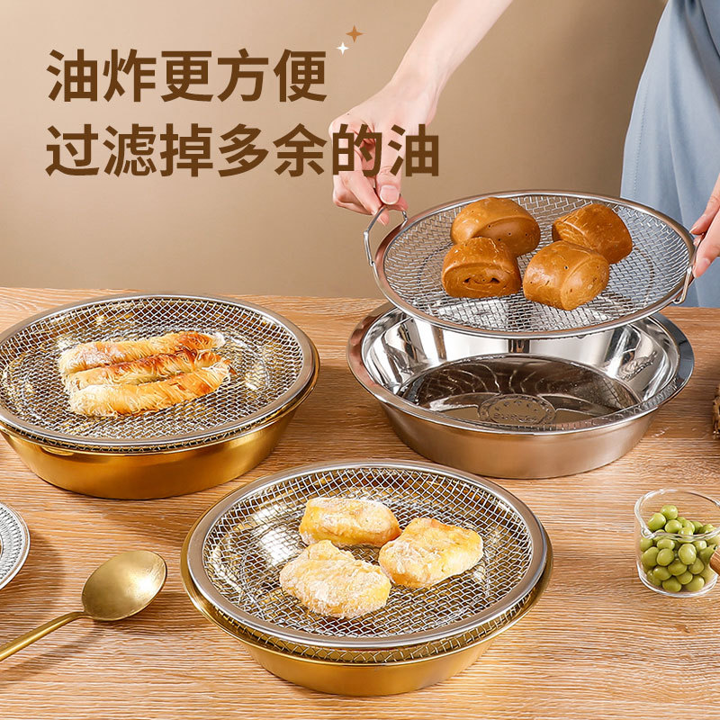 Piring dapur rumah tangga besi anti karat 304, piring penyaring minyak goreng barbekyu dengan pegangan, piring pengering minyak pendingin