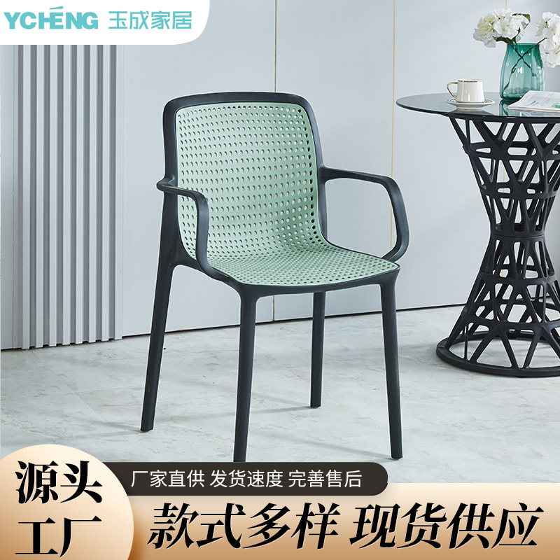 Kursi rotan plastik tebal Nordik, kursi meja rumah luar ruangan dapat ditumpuk sandaran sedang kuno dengan sandaran tangan