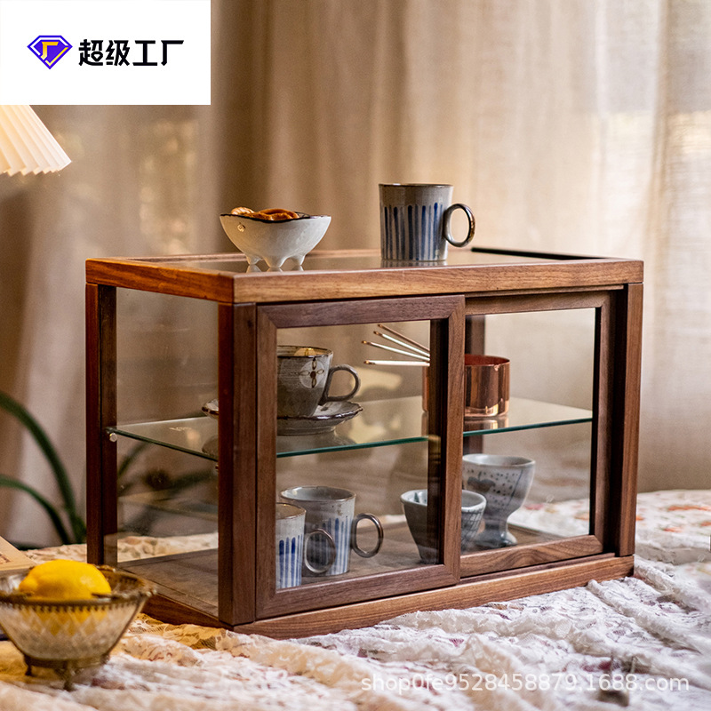 Kabinet penyimpanan kaca kayu padat hitam walnut desktop multi-lapisan kabinet tampilan ruang teh set penyimpanan lemari kaca tahan debu