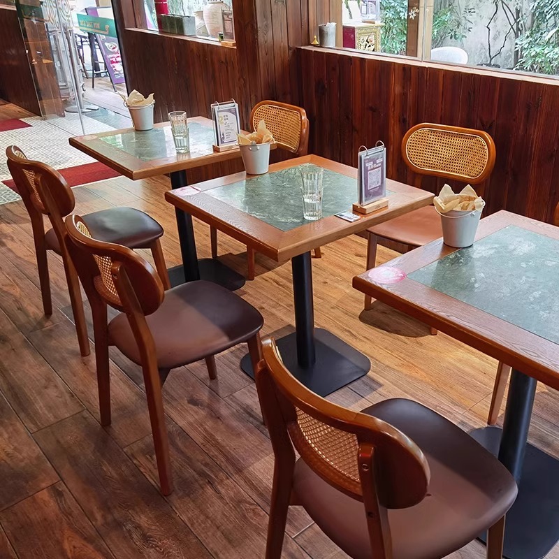 Meja dan kursi kedai kopi, kayu solid, gaya retro Amerika, kedai minuman, restoran teh, meja persegi, toko roti, kursi teh sore, penggunaan komersial