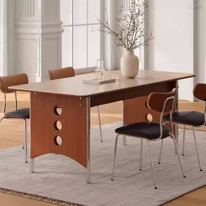 Meja Makan Papan Batu Menengah Retro Rumah Tangga Stainless Steel Persegi Panjang Meja Makan Kombinasi Meja Makan dan Kursi Kayu Solid Berkualitas Tinggi