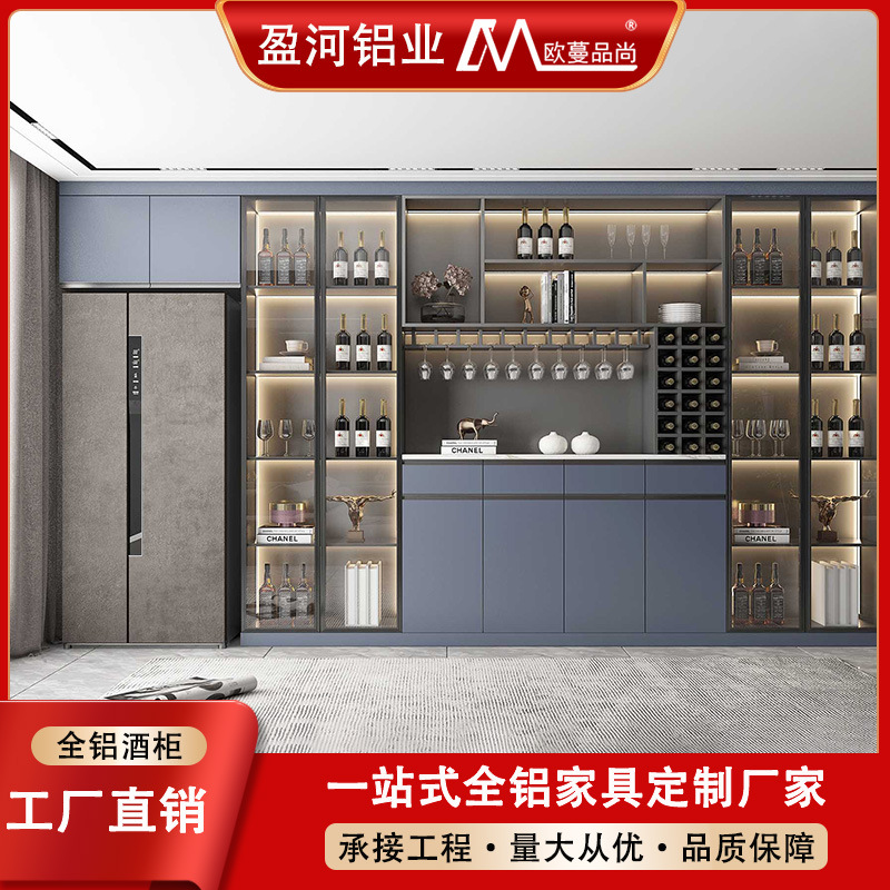 Kabinet tinggi sisi makan lampu logam campuran aluminium, kabinet dinding terintegrasi, pintu kaca tampilan penyimpanan dengan lampu kustomisasi seluruh rumah