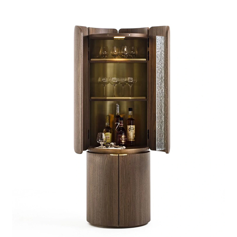 Italia Walnut Bulat Lemari Minuman Anggur Bergaya Artistik Model Desainer Lemari Bar Kelas Atas dengan Lampu Lemari Sisi Dua Pintu Terbuka