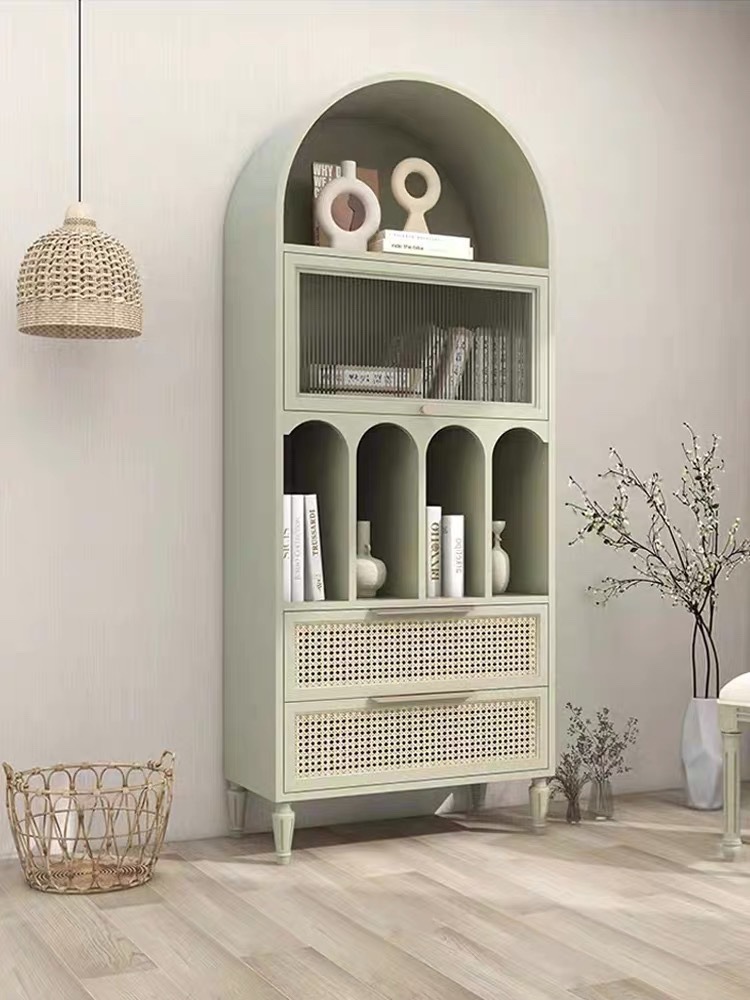 Lemari buku kayu padat gaya Amerika, lemari buku anggur lantai kecil dekorasi lengkungan retro Prancis kabinet samping Nordik