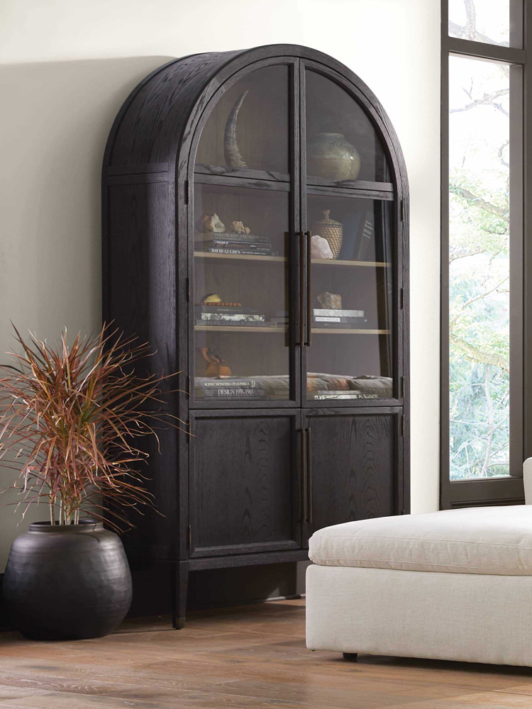 Casing buku kayu padat mewah ringan gaya Amerika kabinet Tampilan Pintu Kabinet kaca lengkung hitam ruang tamu kabinet anggur gaya Perancis