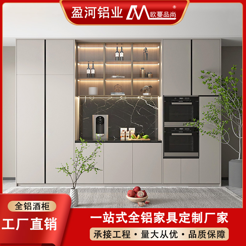 Foshan kabinet anggur logam campuran aluminium disesuaikan dinding rumah kapasitas besar tampilan lampu terintegrasi susu mewah warna teh sisi makan lemari anggur