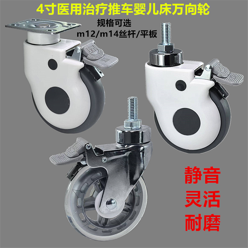 Roda universal sunyi mobil, instrumen troli perawatan medis stainless steel 4 inci M12M14
