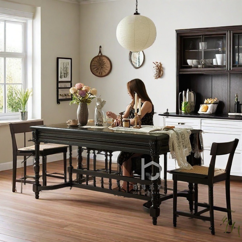 Prancis Retro Kayu Asli Rumah Tangga Kayu Asli Berukir Gaya Amerika Meja Makan Meja Persegi Hitam Sederhana Modern Mewah Ringan