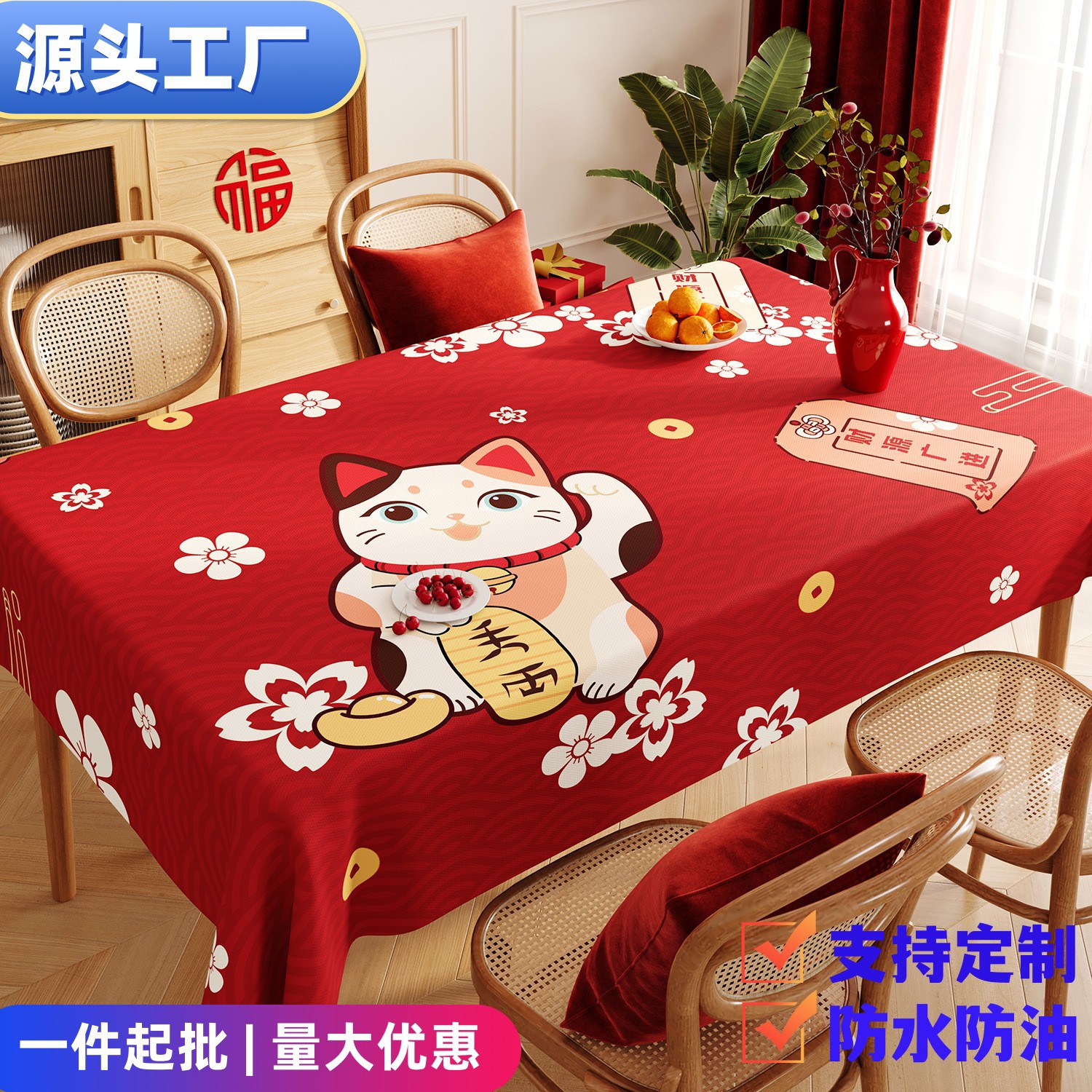 新年春节红色装饰台布方形茶几餐桌防水防油免洗防烫桌布中式桌布