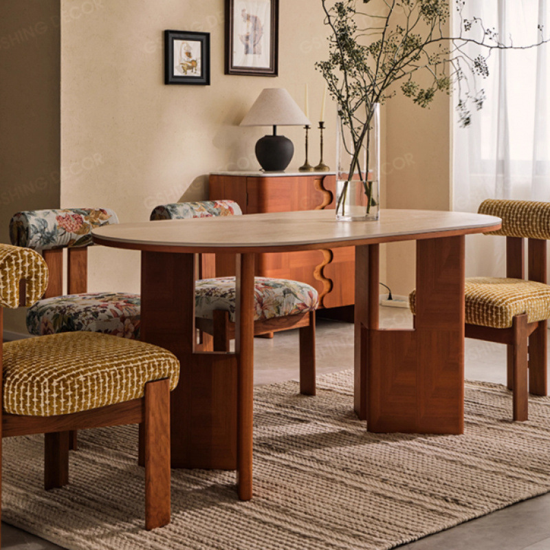 Meja Makan retro Perancis, apartemen kecil Oval kayu solid warna kenari batu terowongan angin piring batu kombinasi meja makan rumah