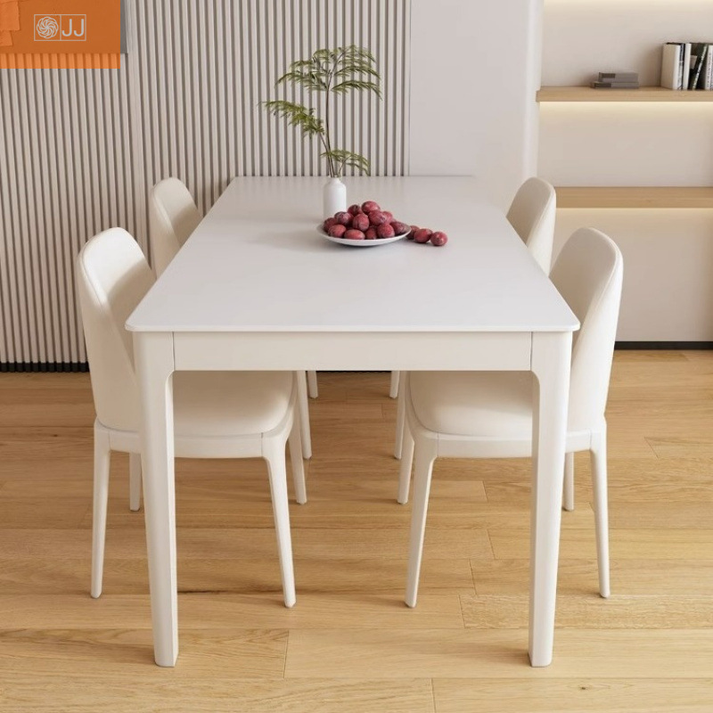 Meja Makan Mewah Ringan Rumah Tangga Nordik Meja Makan Kayu Solid Putih Krim Kombinasi Meja Makan Papan Batu Terang Terang Model Baru
