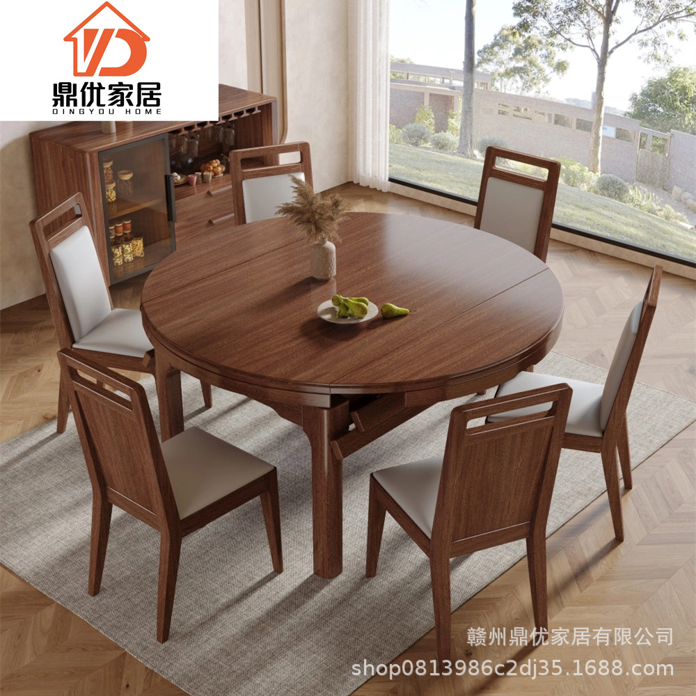 Meja Makan Meja Bundar Kayu Walnut untuk Makan Rumah Tangga Gaya Tiongkok Lipat Teleskopik Kombinasi Meja Makan Kayu Solid