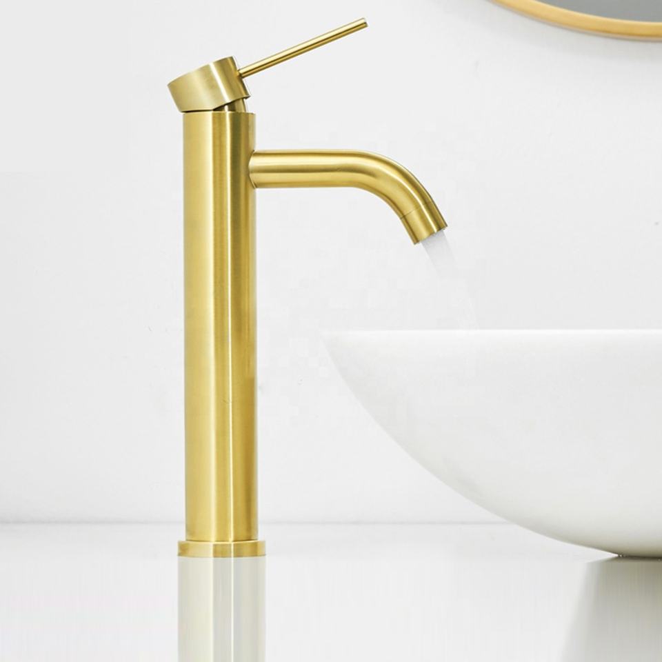 Grosir Pabrik keran wastafel emas disikat besi tahan karat keran kamar mandi rumah tangga mulut lurus melengkung mulut panas dan dingin