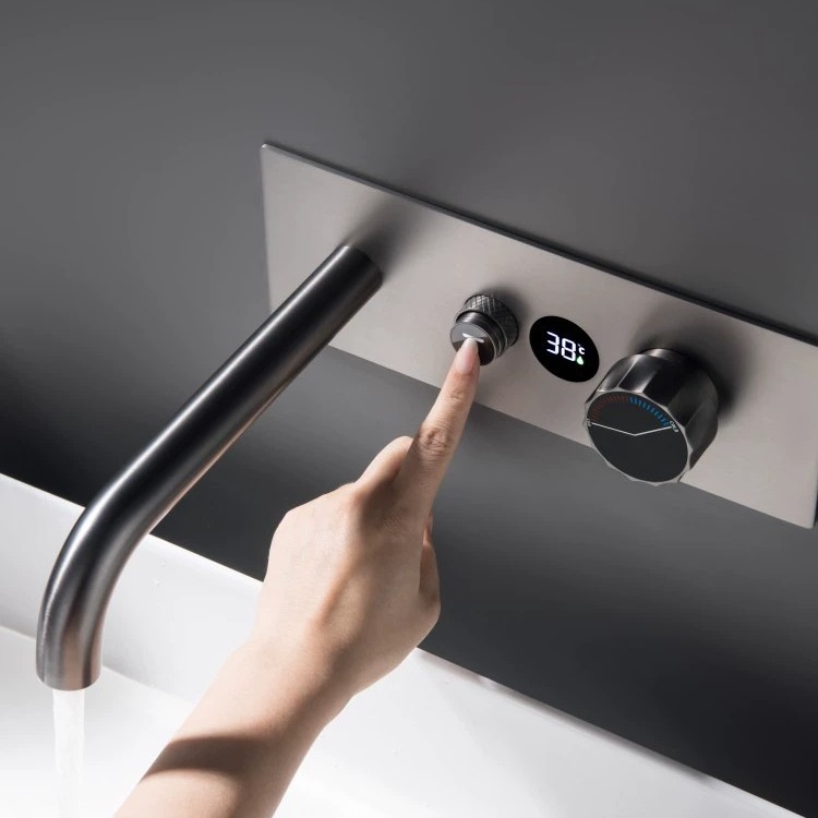 Keran wastafel abu-abu pistol Perancis, tombol keran wastafel tersembunyi suhu konstan, tampilan digital keran tembaga kamar mandi