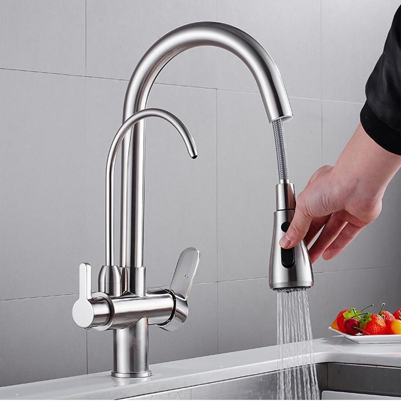 Keran air murni dapur kuningan, keran pull-out, air murni tiga dalam satu wastafel, bak cuci piring, keran panas dan dingin