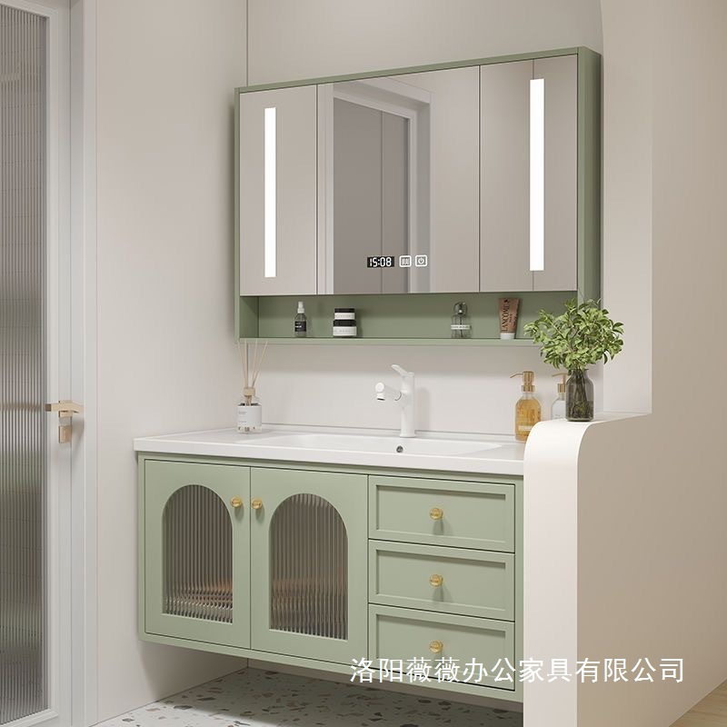Rak kecantikan panel pintu kombinasi kabinet kamar mandi kayu padat lemari cermin busur pintar meja cuci emas Baisheng 8033 kamar mandi