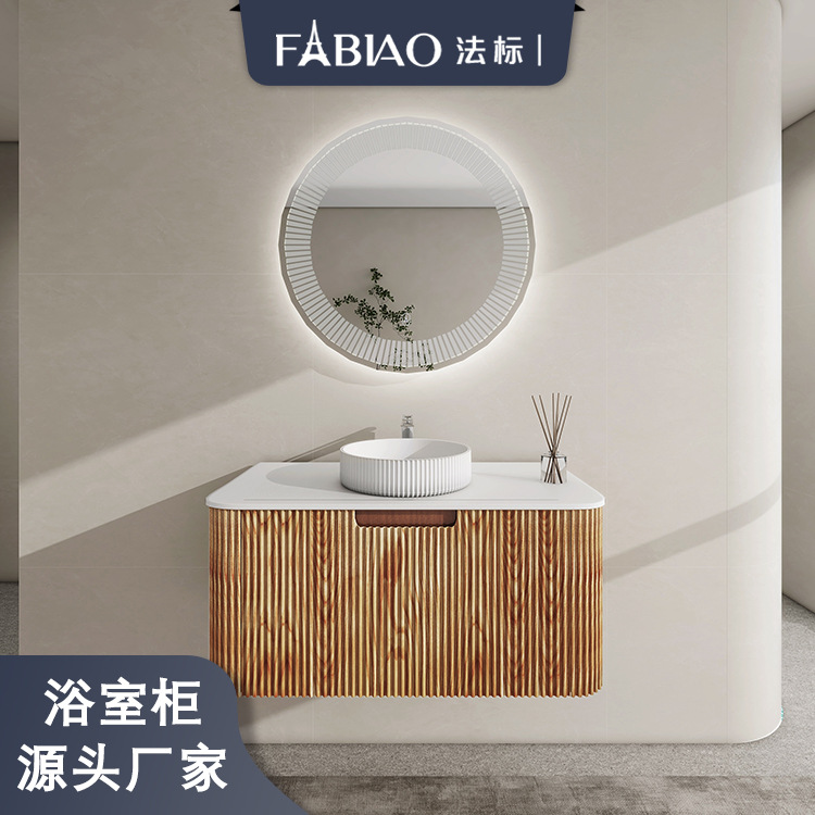 2024 baru Hotel gaya ins warna kayu bergaris Dinding kabinet kamar mandi bulat tambalan konter baskom kabinet kamar mandi