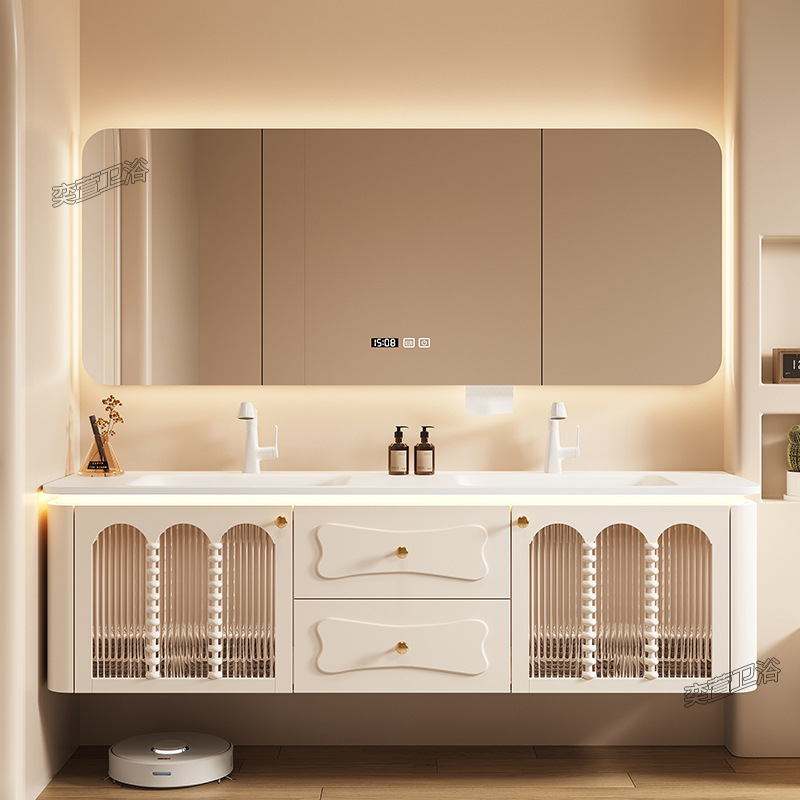 Lemari Kamar Mandi Dua Pot Gaya Krim Gaya Prancis Kombinasi Papan Batu Bengkok Panas Satu Tubuh Lemari Cerdas Meja Cuci Kamar Mandi Retro