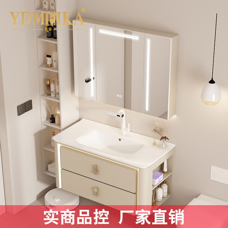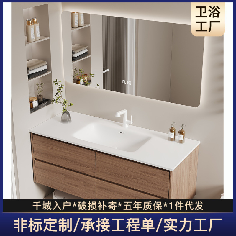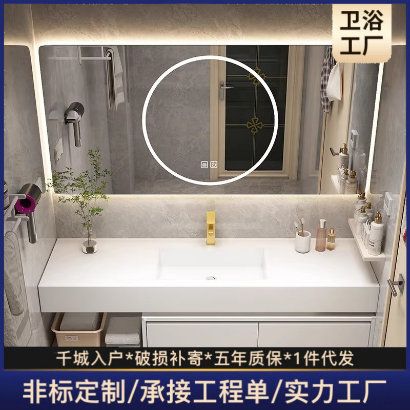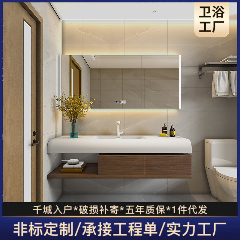 Apartemen kecil kabinet kamar mandi kayu padat kombinasi piring batu rak kecantikan meja cermin pintar meja cuci Huangma kamar mandi E38
