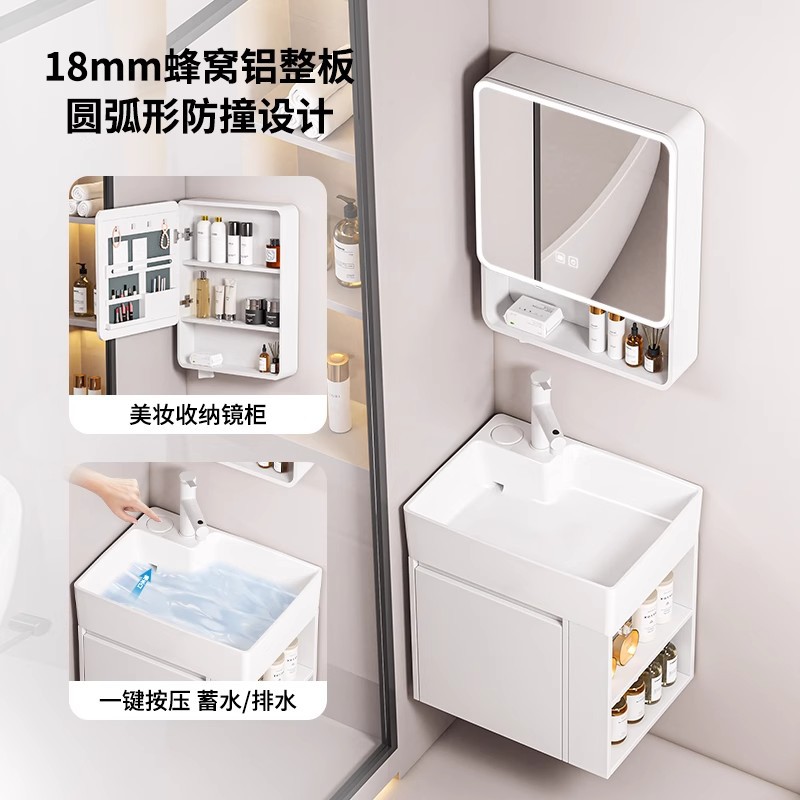 Kabinet kamar mandi lengkung untuk apartemen kecil dengan wastafel dalam, kombinasi kabinet wastafel aluminium honeycomb hemat ruang untuk meja rias kamar mandi.