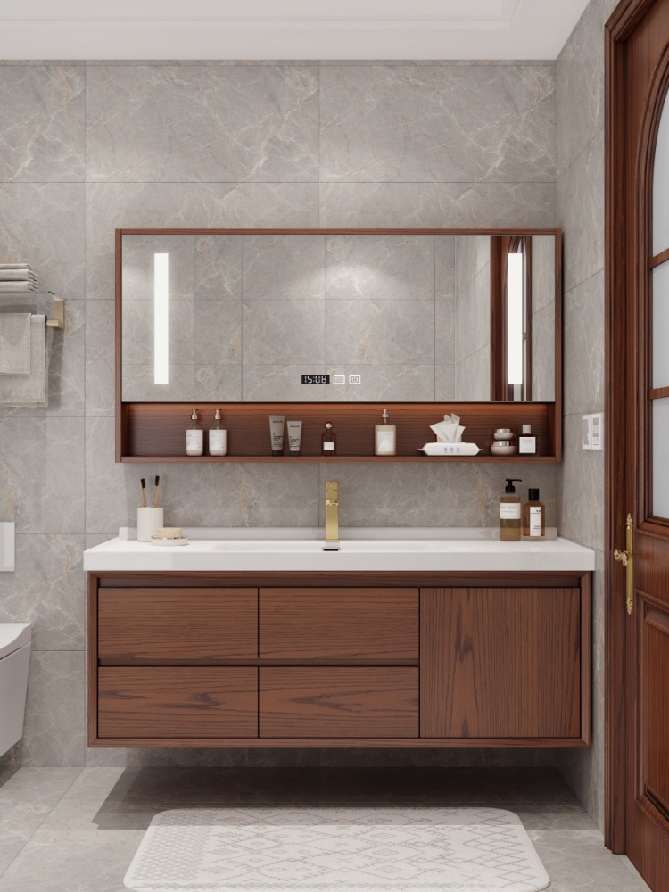 Kabinet kamar mandi baskom terintegrasi keramik ek merah baru gaya Tiongkok kombinasi oak kayu solid kabinet kamar mandi cerdas modern ringan mewah
