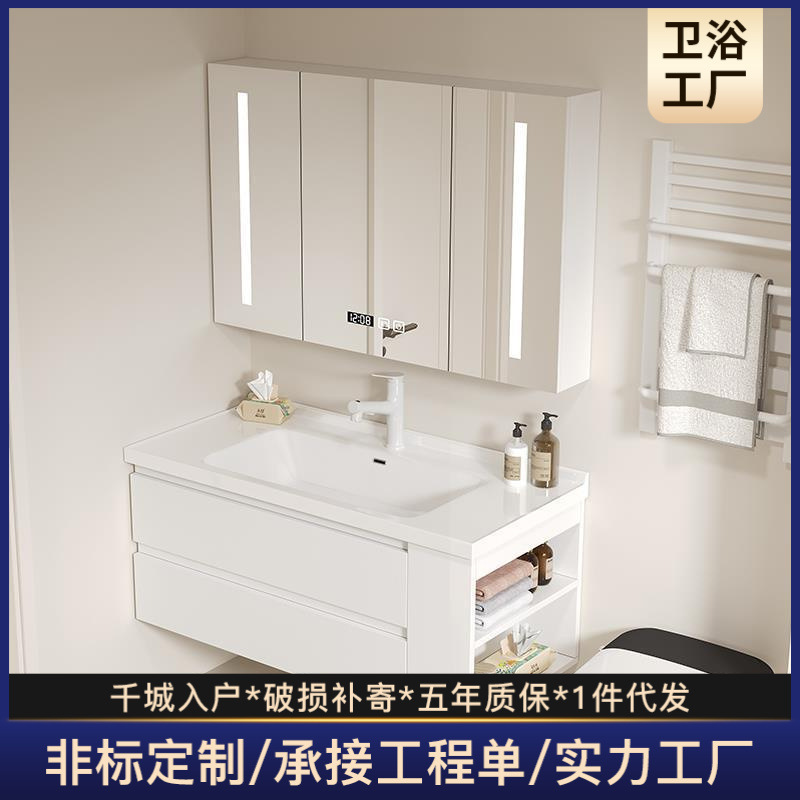 Baskom Keramik Meja Lebar Sisi Kiri dan Kanan Lemari Kamar Mandi Kayu Solid dengan Lubang Handuk Kertas Lemari Cermin Cerdas H07