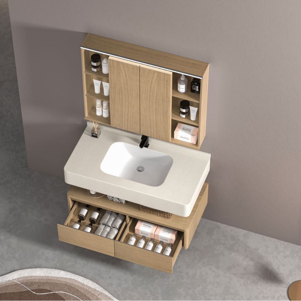 Lemari Gantung Kayu Solid Gaya Hotel Warna Kayu Asli Lemari Cermin Wastafel Kamar Mandi Meja Cuci Tangan Modern Sederhana Lemari Kamar Mandi