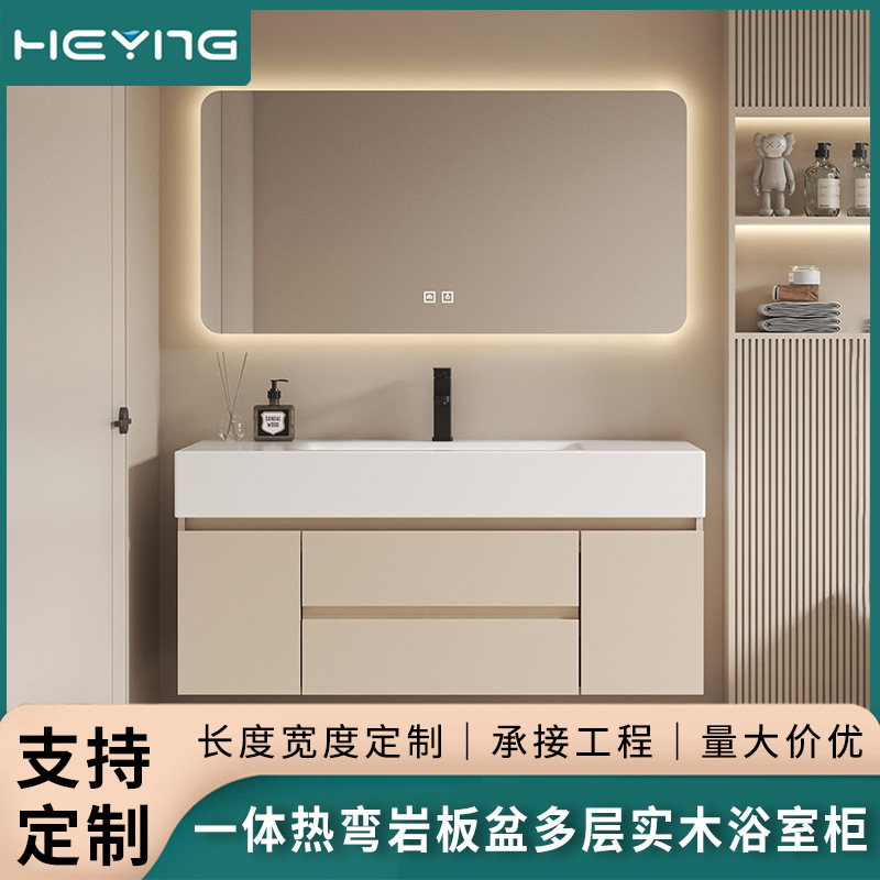 Lemari Kamar Mandi Kayu Solid Multi-layer Kombinasi Papan Batu Panas Bengkok Pembersih Rumah Tangga Wastafel Kamar Mandi Mendukung Kustomisasi