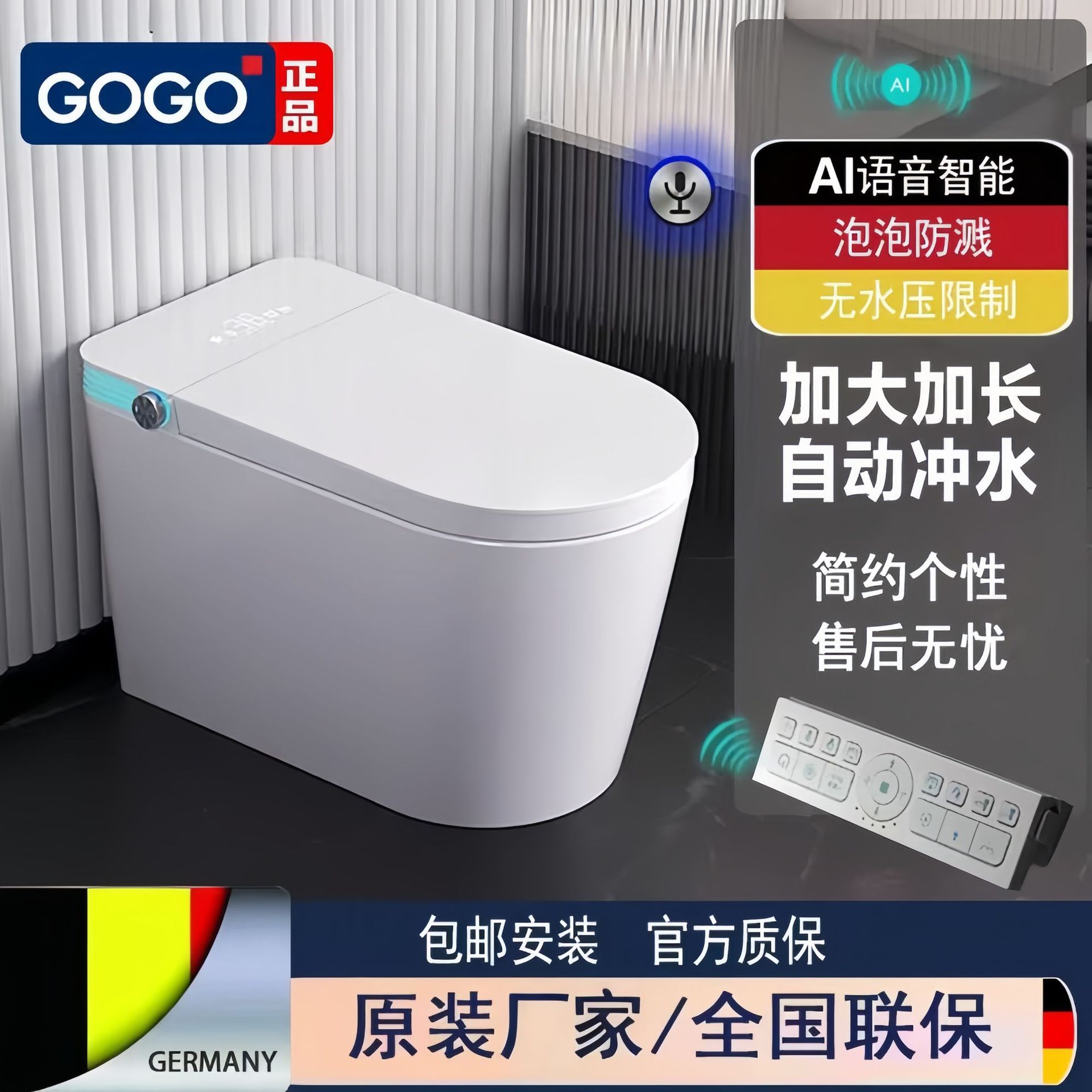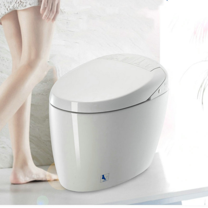 Toilet pintar untuk perdagangan luar negeri dengan pelindung gelembung tersembunyi terintegrasi, pembilasan mekanis, sensor otomatis flip-top, dan pelindung busa.