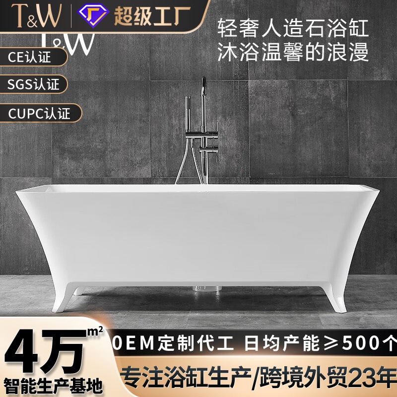 Bak Mandi Tipe Berdiri Travere Bak Mandi Orang Dewasa dengan Kaki Satu Bentuk Persegi Panjang PMMA Batu Buatan Rumah Tipe Kecil