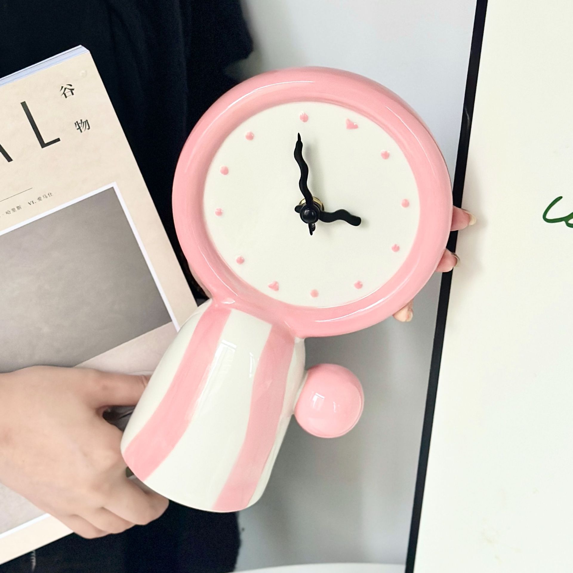粉色条纹时钟客厅摆件家居装饰办公桌面电视柜玄关轻奢陶瓷座钟