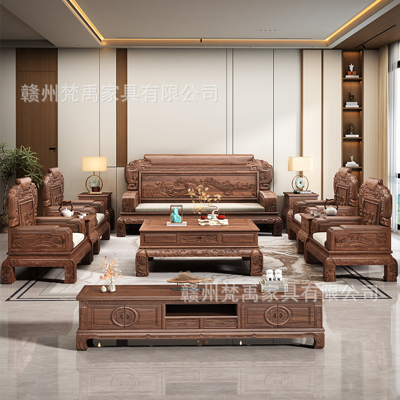 Sofa Kayu Wujin Gaya Tiongkok Baru Kombinasi Modern Ringan Villa Mewah Ruang Tamu Seluruh Rumah Perabot Kantor Sofa Kayu Solid
