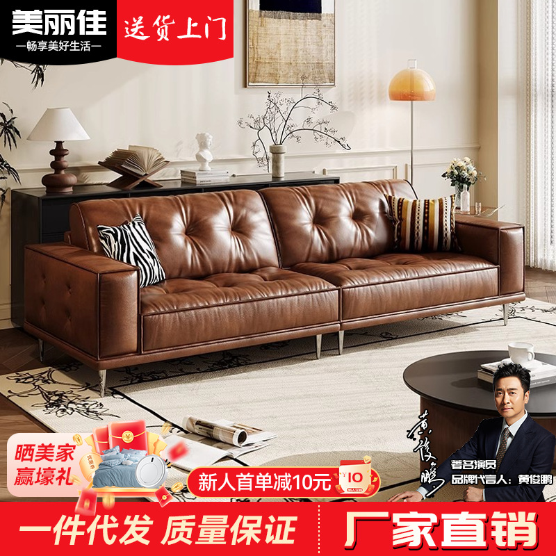 Sofa Kulit Asli Sofa Seni Kulit Lilin Minyak Gaya Pertengahan Model Baru 2025 Sofa Lurus Sofa Kaki Tinggi Ruang Tamu Tipe Kecil