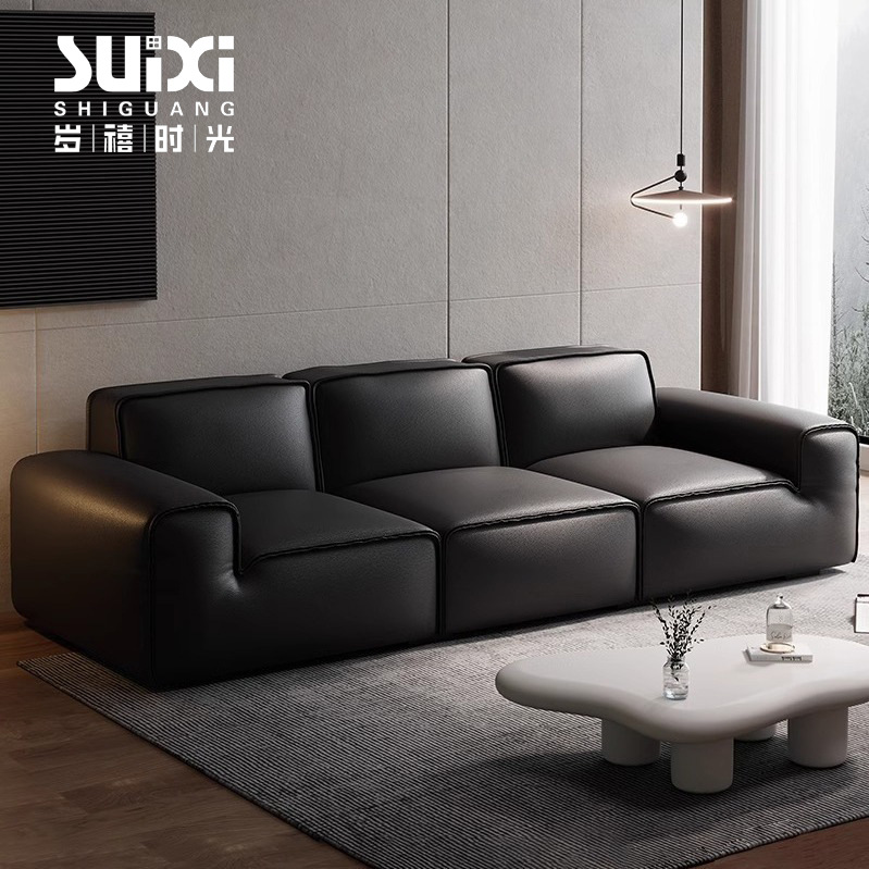 Sofa Kulit Asli Sapi Hitam Besar Warna Hitam Minimalis Gaya Italia Lapisan Kepala Ruang Tamu Kulit Sapi Ringan Mewah Modern Lurus Tiga Empat Orang