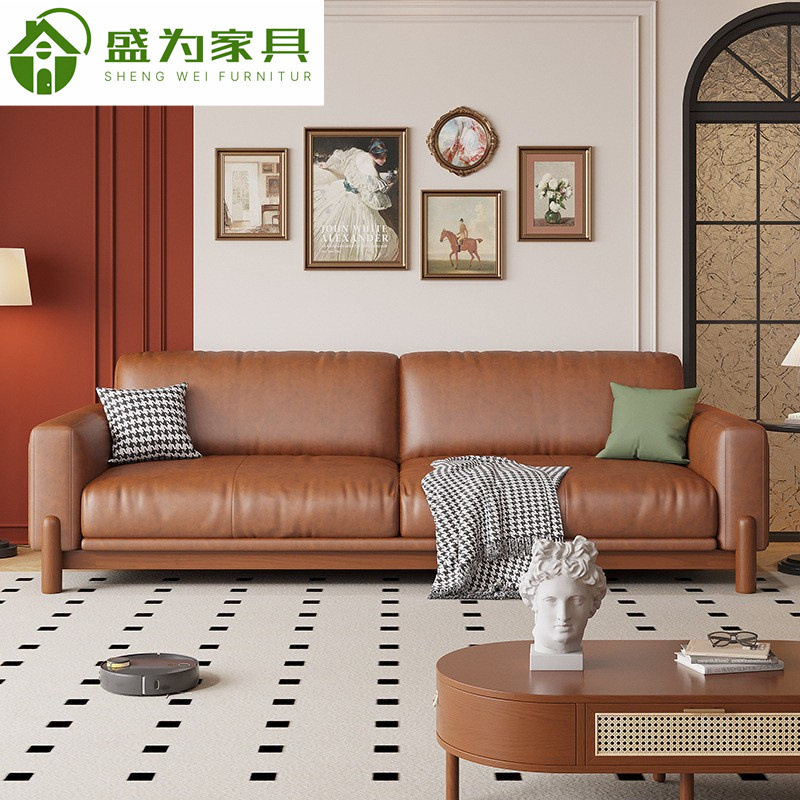 Sofa kulit ruang tamu modern sederhana, lilin minyak kulit dapat dilepas dan dicuci rumah tangga apartemen kecil baris lurus sofa seni kulit kayu padat