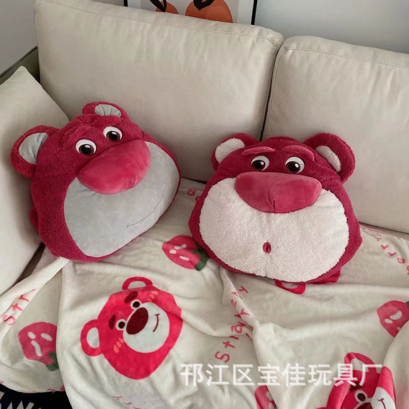 Selimut bantal beruang stroberi kartun, penghangat tangan selimut tidur siang kantor bantal mobil tiga-dalam-satu