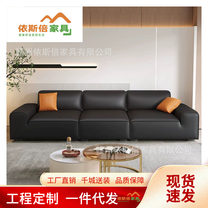 Sofa kulit minimalis Italia, ruang tamu besar hitam sapi kombinasi modern minimalis kelas atas kain sofa baris lurus