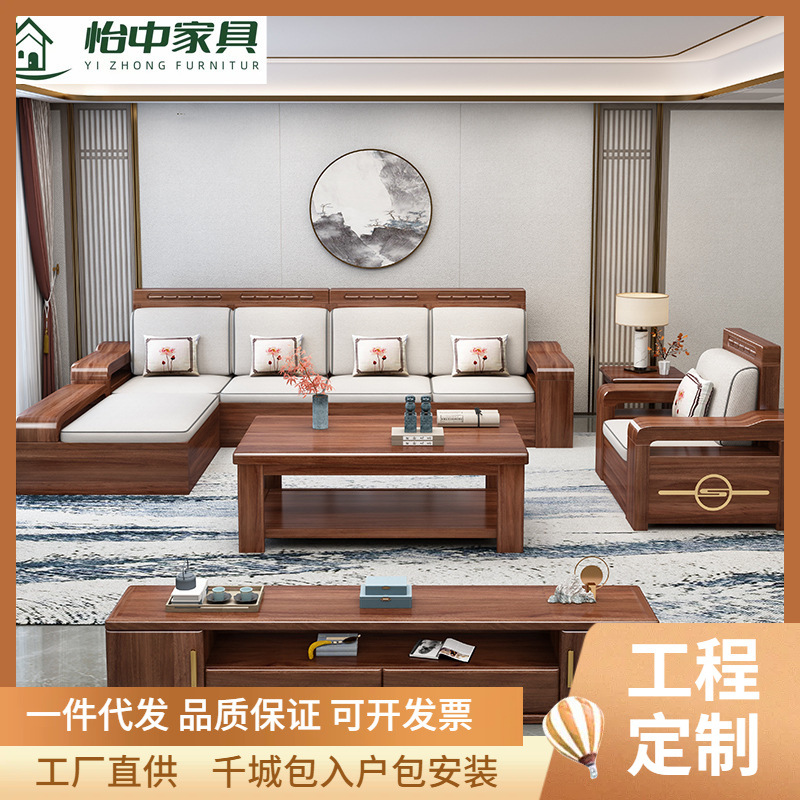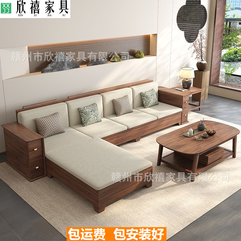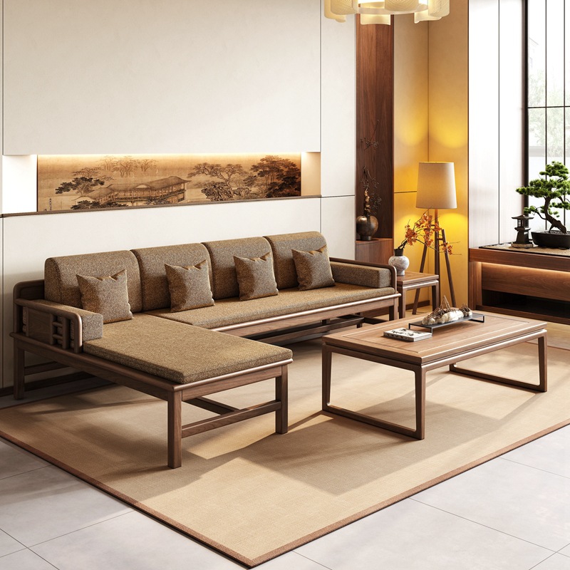 Sofa kombinasi kayu padat kenari hitam Amerika Utara kain minimalis modern ruang tamu Villa ruang teh sofa empat orang