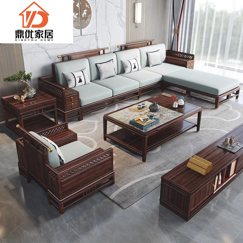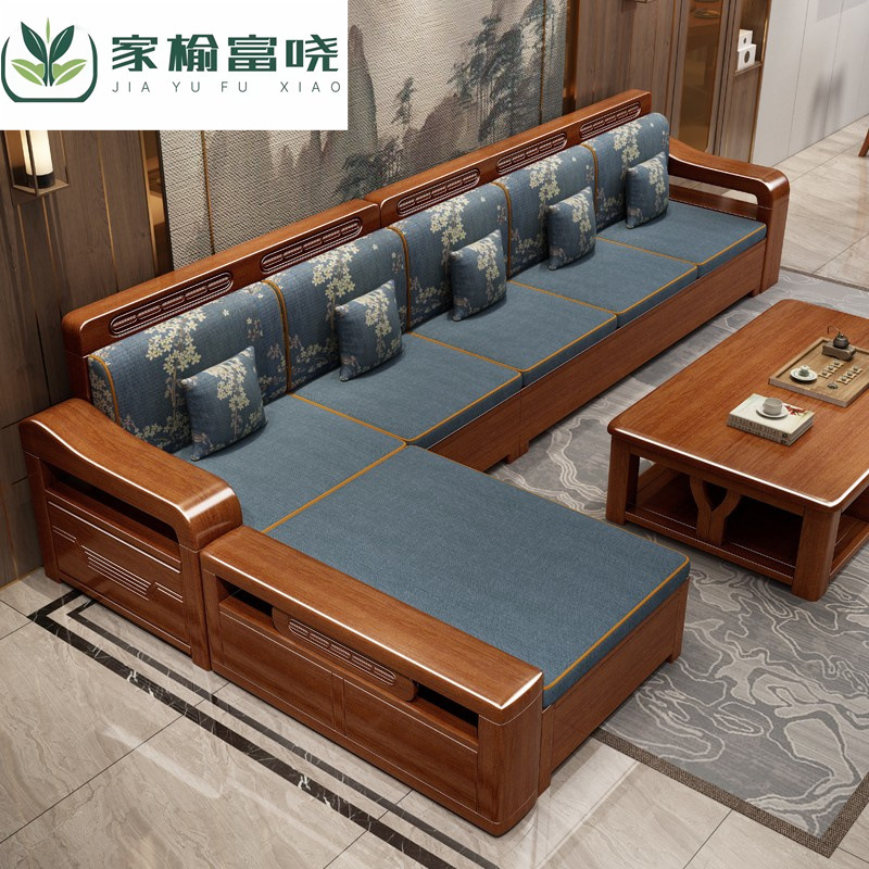 Set Sofa Kayu Solid Sudut Gaya Tiongkok Modern Set Sofa Kayu Solid untuk Penyimpanan Kotak Tinggi Kayu Solid Kayu Walnut Perabot Ruang Tamu