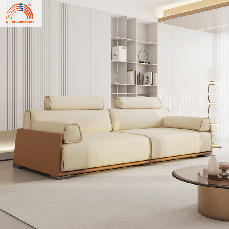 Sofa Kulit Asli Minimalis Gaya Perancis Sofa Kulit Minyak Retro Deretan Lurus Kulit Sapi Lapisan Kepala Warna Karamel Mewah Ringan Ruang Tamu
