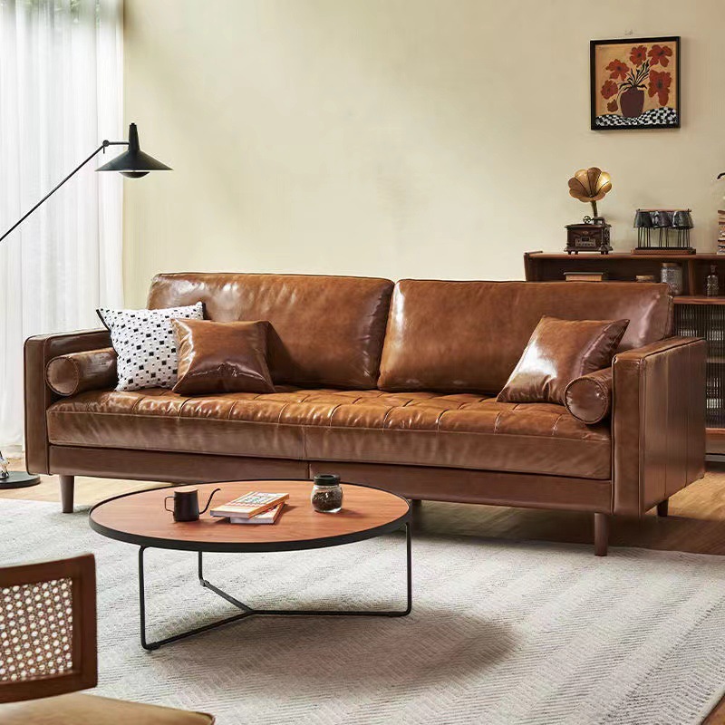 Sofa Kulit Asli Lapisan Pertama Kulit Sapi Mewah Ringan Perabot Ruang Tamu Retro Pedesaan Perabot Tarik Kulit Labu Minyak Gaya Kuno Sofa Foshan