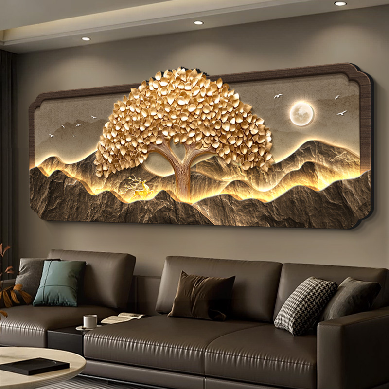 2025客厅装饰画led灯发财树沙发背景墙壁画高级感茶室办公室挂画